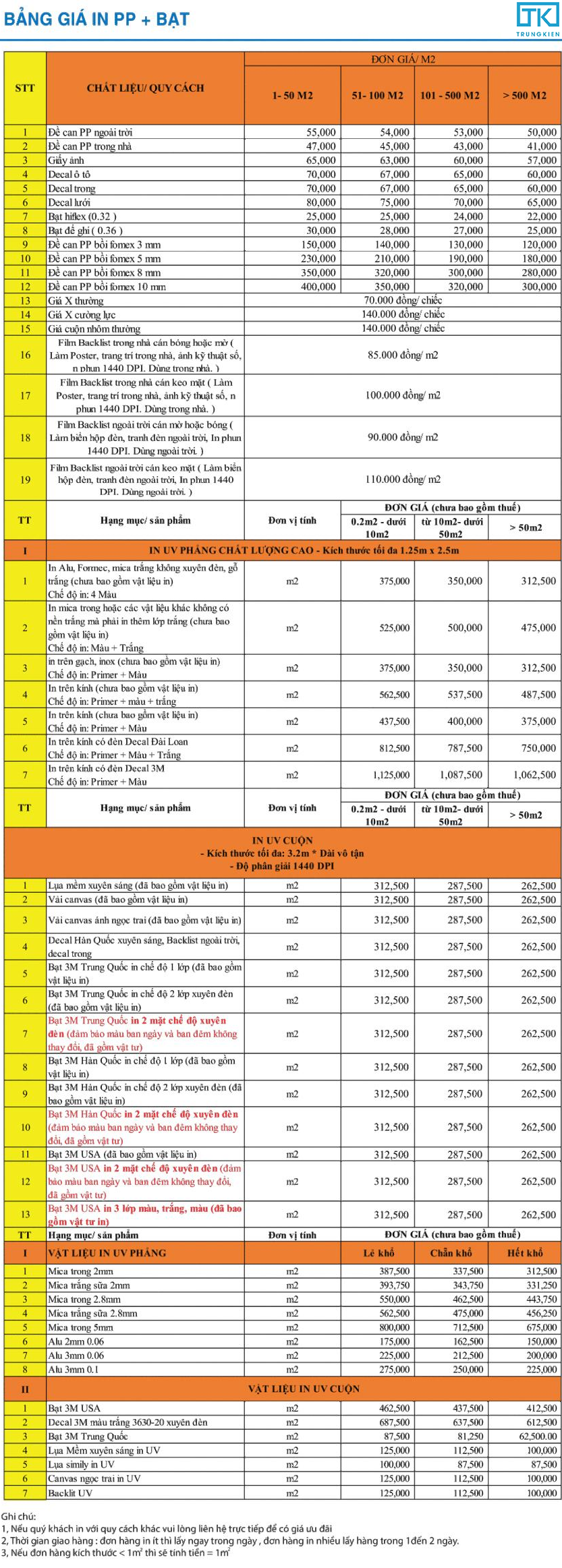 Bảng Giá In Bạt, PP, UV
