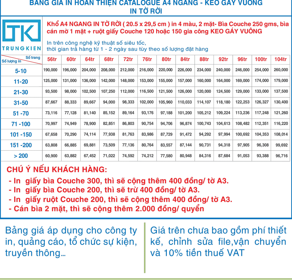 | BẢNG GIÁ IN NHANH CATALOGUE KHỔ A4 ĐỨNG – GHIM LỒNG | ||||||||||||
