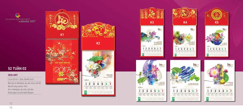 - Lịch treo tường: Lịch lò xo giữa 13 tờ, Lịch lò xo 7 tờ, phôi có sẵn lịch 1-5 tờ nẹp thiếc.
